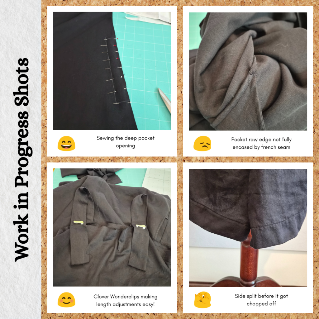 The hem split was interesting and I think it could be a handy technique to keep in mind for other projects. But given I’ve shortened this so much, I think I might be able to skip this part and just do a normal hem facing instead (to keep consistent with the way the top is finished).