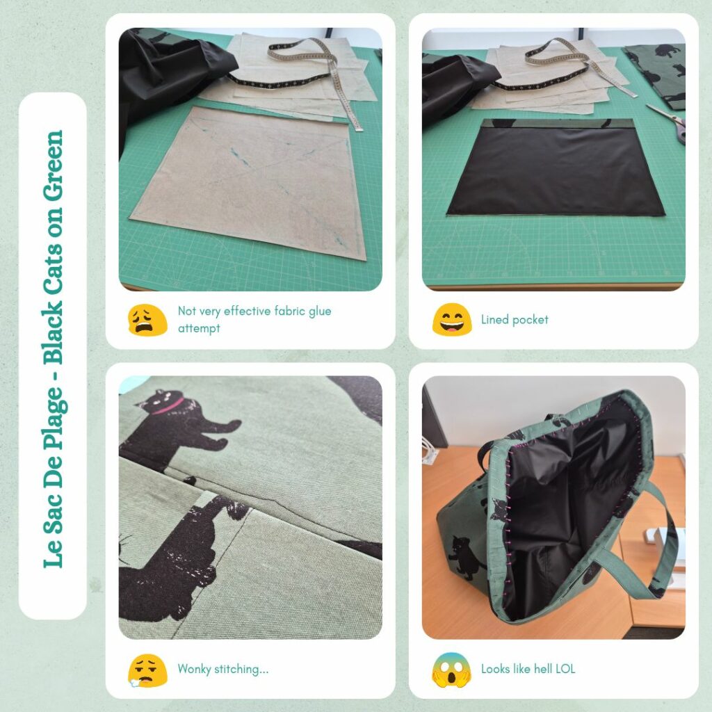 I prefer the structure of this version of the bag, although it does make it look very big! I do think a woven interfacing would be that good level of structure without the stiffness though. I showed my husband and he said the rivets looked like you could snap them together and that’s a thought. Maybe such a wide bag could do with some top snaps, although I probably would add 3 – one in the centre and two either side, halfway between the strap and side of the bag. Also, I got fairly lucky with my pattern placement for the pocket…if it was all decapitated cats that wouldn’t be a good look LOL. Something I need to keep in mind for any projects with large pattern prints.