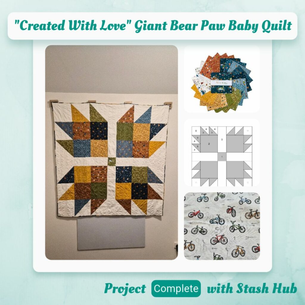 My husband’s other cycling friends are having a baby in May and were included in his request to make cycling baby quilts. The design of this quilt kind of worked backwards from the backing bike fabric LOL. Since we knew the baby was going to be a boy, I knew I probably couldn’t use anything cute or floral (I don’t believe in the blue = boy, pink/flowers = girl, but I feel like this seems to still be the default for most people, so not gonna rock the boat). Which made the bike fabric search trickier…compounded by the fact that my husband said it needed to be road bikes. Like seriously? It’s hard enough finding bike related fabric let alone a specific type of bike 🙄 At least this one seemed to be acceptable… Then I bought a layer cake since the colours seemed to match the bikes on the backing fabric pretty well. What I didn’t realise though was that Created With Love didn’t refer to handmade, it was biblical 😅 I have no idea if these friends are religious or not, so removed all the obviously God related prints.
