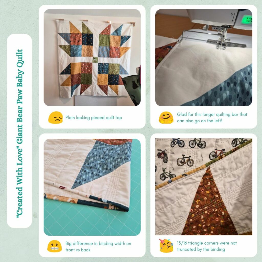 I learnt a couple of things from this project. One is I think charm squares are my preference for largest size fabric block (as in non-pieced block). Another is I should use my Math for Quilters booklet for binding widths, I definitely made it too wide this time. And I need to be pickier in terms of fabric selection. I chose this layer cake because the colours matched with the backing. But the shades weren’t really to my tastes, so I didn’t enjoy making this quilt that much because I wasn’t fond of the colours. So even if I’m making something for someone else, I need to make sure I love the fabrics and design because otherwise I don’t fully enjoy making the project 😅 I guess since it’s my time I’m investing I need to be more selfish so I enjoy the process.