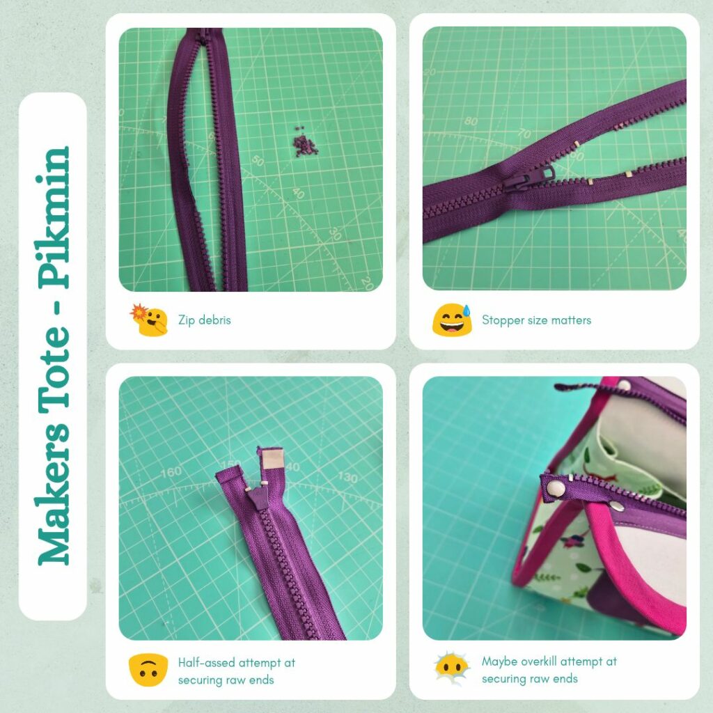 I was planning on using snap buttons since I hadn’t bought a zip, but I realised that I had a purple chunky jacket zip that was the wrong shade of purple for the project I originally intended it for. It was too long but figured I could use this opportunity to learn how to shorten a plastic zip. Luckily I had already bought the required tools quite a few months ago, because I knew that at some point I would have to stop procrastinating and learn how to do this haha. I remember seeing tutorials from various websites and feeling overwhelmed, but when I looked it up this time I found the Threads Magazine tutorial which laid things out really nice and simply. And once I realised that the plastic was just fused to the tape and so I just needed to pry it off, I felt a lot less intimidated. My main challenge was whenever I snipped the tooth part off it would go flying across the room somewhere…I figured out that if I cup my left hand over the nippers before snipping it would hit my palm and land on the table. It sure does sting though LOL. And more validation that buying supplies in advance is a good thing, I had the zipper stops from Jack Stock Haberdashery on hand which meant even though I suddenly decided to use a modified length zipper I didn’t need to wait for supplies to arrive and kill my momentum/motivation. I did use the wrong size for starters, I assumed since the zipper was chunky I would have to use the big stopper, but it was too loose and could slide up and down the zip tape. Also good that I bought multiple sizes since I had no idea which I would need 😂