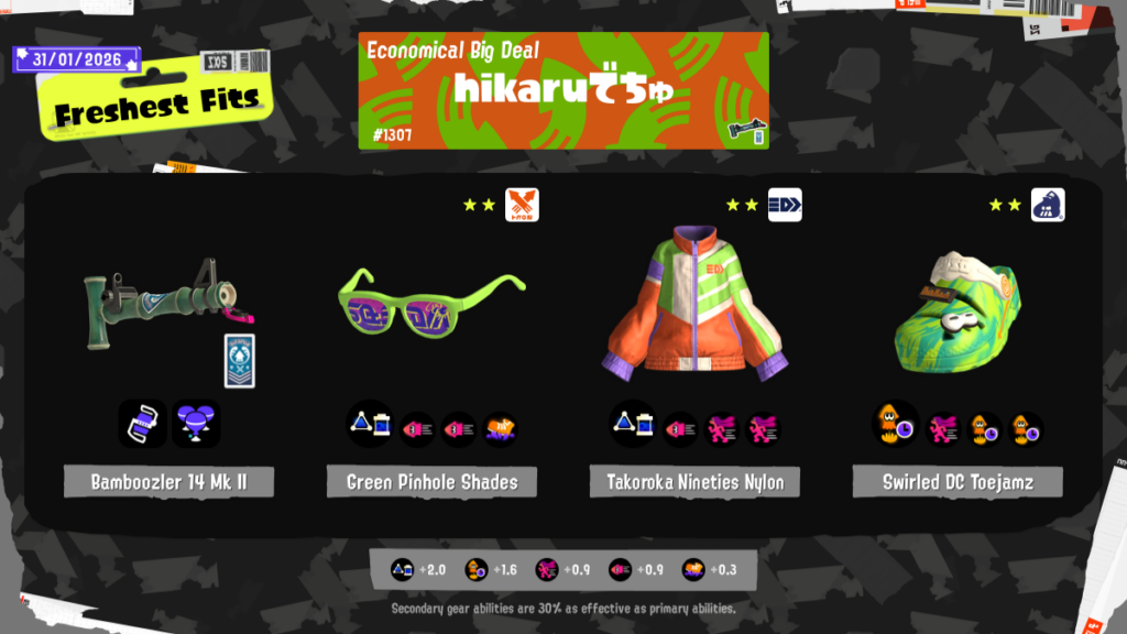 Gear Intent: Lots of sub saver cos Fizzy Bomb so good. Lots of QSJ because if I miss my shots best to bail before they get closer and save Chumps for trying to get back in. A bit of mobility for strafing and repositioning.